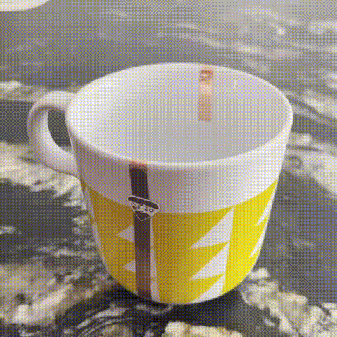 The teacup when lit from being filled with water. The battery is hidden at the bottom of the mug.